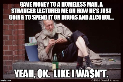 The instinctual progressive response in this situation is often: regardless of how this man is going to use the money, there exists some obligation to give him money. I’ve seen countless memes like this one: